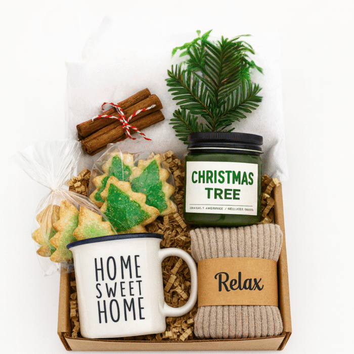 Setin içeriğini oluşturan ürünler—çam ağacı kurabiyelerden yılbaşı esintili muma, ev sıcaklığını yansıtan kupadan yumuşacık cozy çoraplara kadar—tamamen yeni yılın sıcak ve huzurlu atmosferini taşır.
